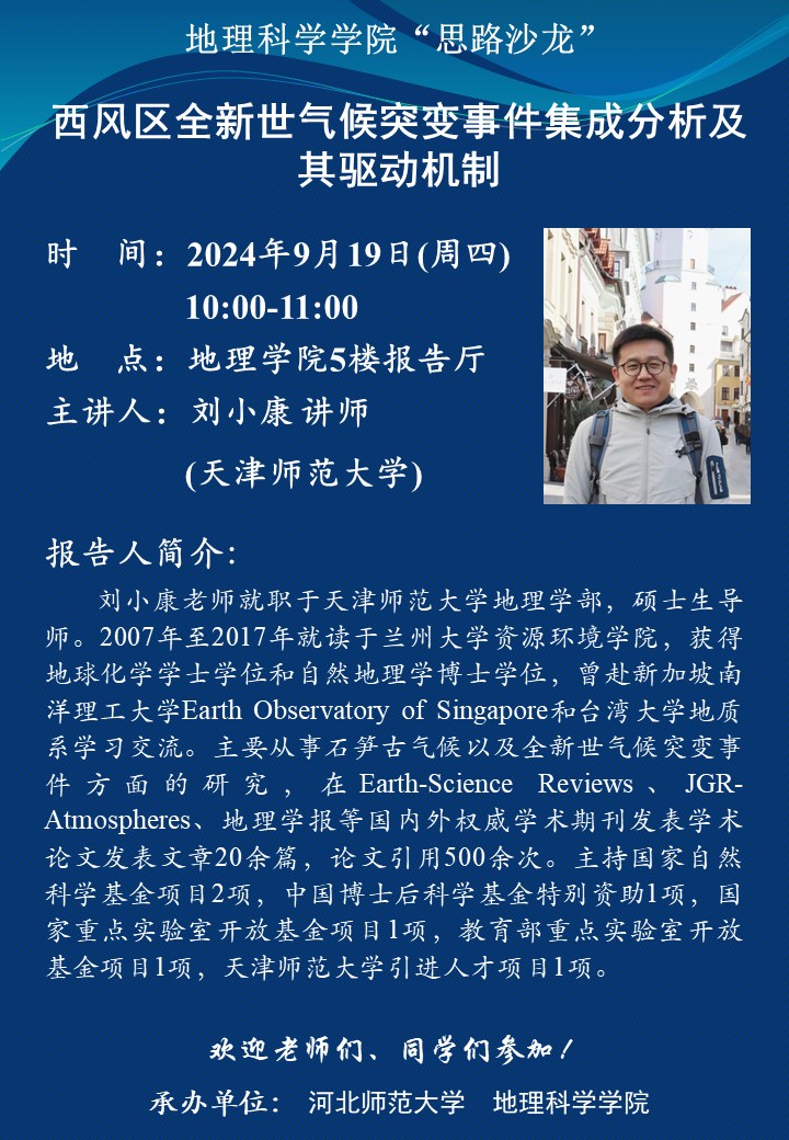 主讲人及简介:刘小康,男,1990年生,天津师范大学地理学部讲师、硕士生导师。2007年至2017年就读于兰州大学资源环境学院,获得地球化学学士学位和自然地理学博士学位,曾赴新加坡南洋理工大学EarthObservatory of Singapore和台湾大学地质系学习交流。主要从事石笋古气候以及全新世气候突变事件方面的研究,在Earth-ScienceReviews、JGR-Atmospheres、地理学报等国内外权威学术期刊发表学术论文发表文章20余篇,论文引用500余次。主持国家自然科学基金项目2项,中国博士后科学基金特别资助1项,国家重点实验室开放基金项目1项,教育部重点实验室开放基金项目1项,天津师范大学引进人才项目1项。